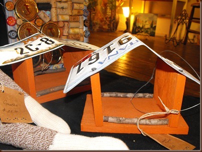 Mary-Gail has a fun and quirky style that produces these character sock monkeys, vintage license plate birdhouses, quilts and unique memo boards.